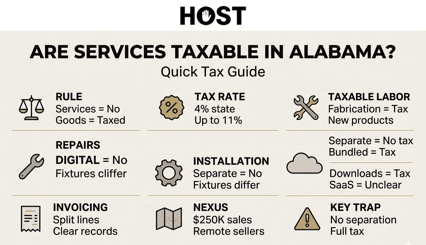 The short answer: Alabama generally does not tax services. However, labor charges become taxable when bundled with tangible goods, when fabricating new products, or when improperly separated on invoices. Knowing exactly where the line falls keeps you compliant and prevents costly mistakes during audits.