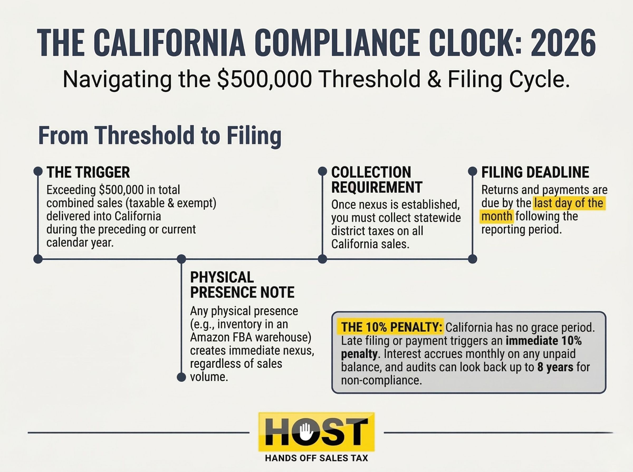 Timing is critical. Once the CDTFA contacts you about non-compliance, VDA eligibility disappears. HOST manages the VDA process from initial contact through negotiation, settlement, and registration.