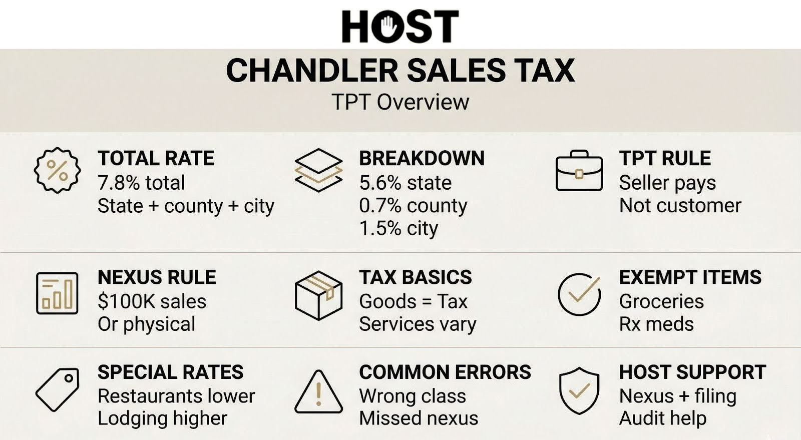 Contact HOST today to discuss your Chandler sales tax needs or schedule a free consultation. Let us handle the tax so you can focus on building your business in one of Arizona’s most dynamic cities.