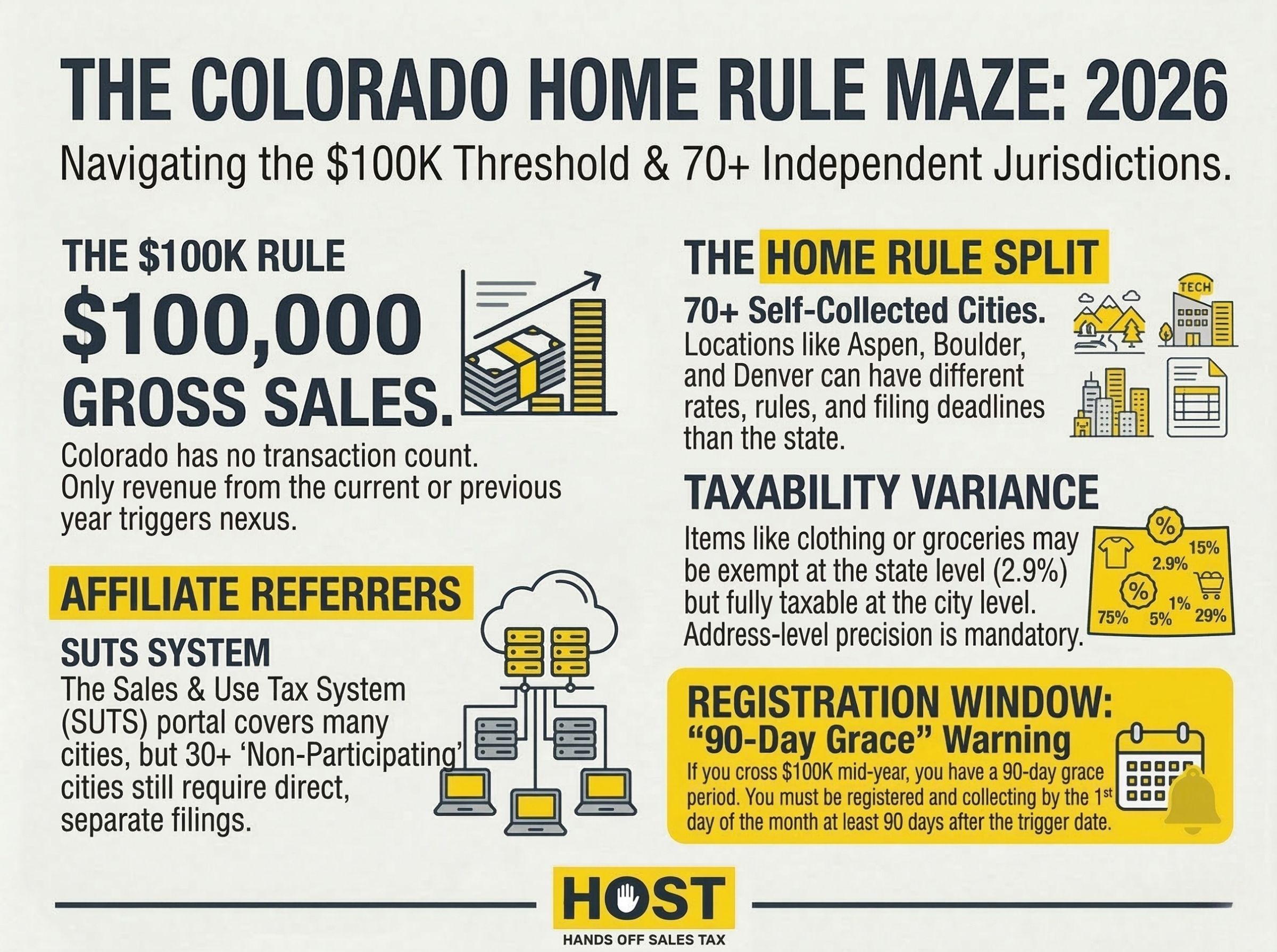 Cross $100,000 in Colorado sales and you’ve triggered economic nexus, even without setting foot in the state. But here’s where it gets messy: Colorado’s home rule cities turn what should be straightforward compliance into a multi-jurisdictional maze that catches most remote sellers completely off guard.