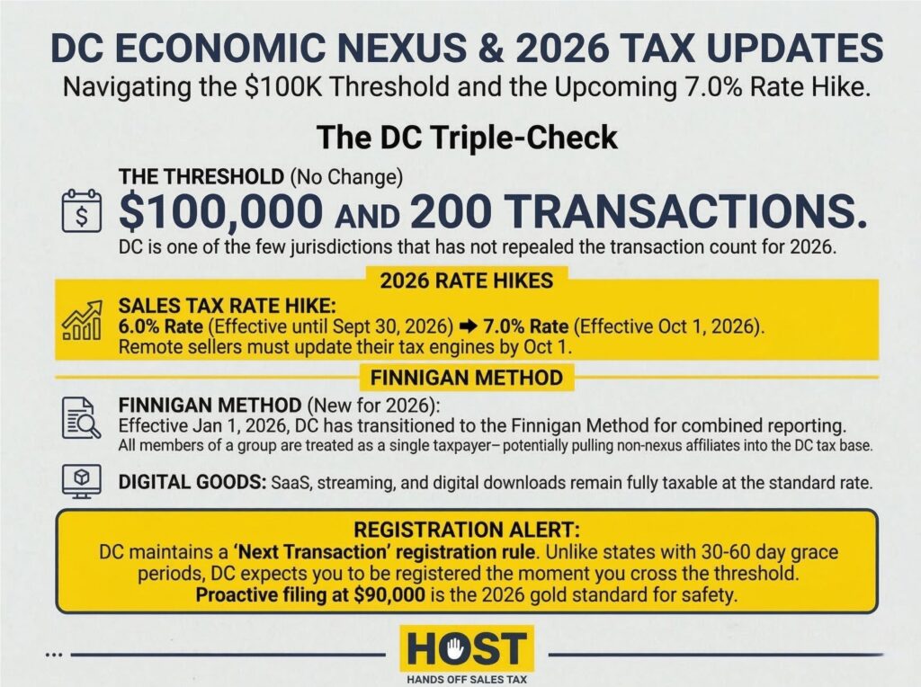 The District of Columbia’s economic nexus threshold is $100,000 in gross receipts OR 200 or more separate retail sales during the previous or current calendar year. Meeting either threshold triggers the collection obligation.