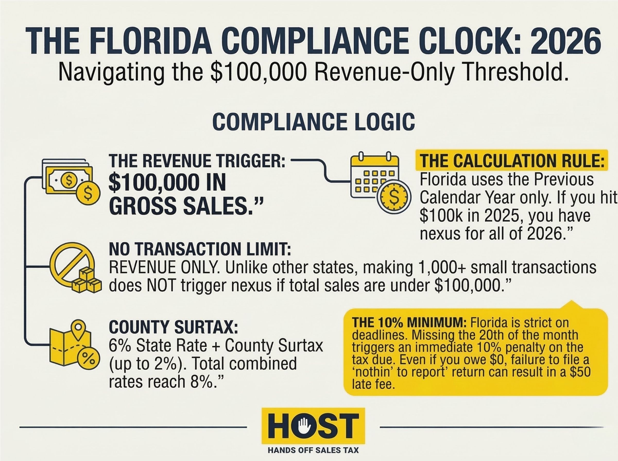 Florida’s economic nexus threshold is straightforward: $100,000 in gross sales delivered to Florida customers in the previous calendar year.