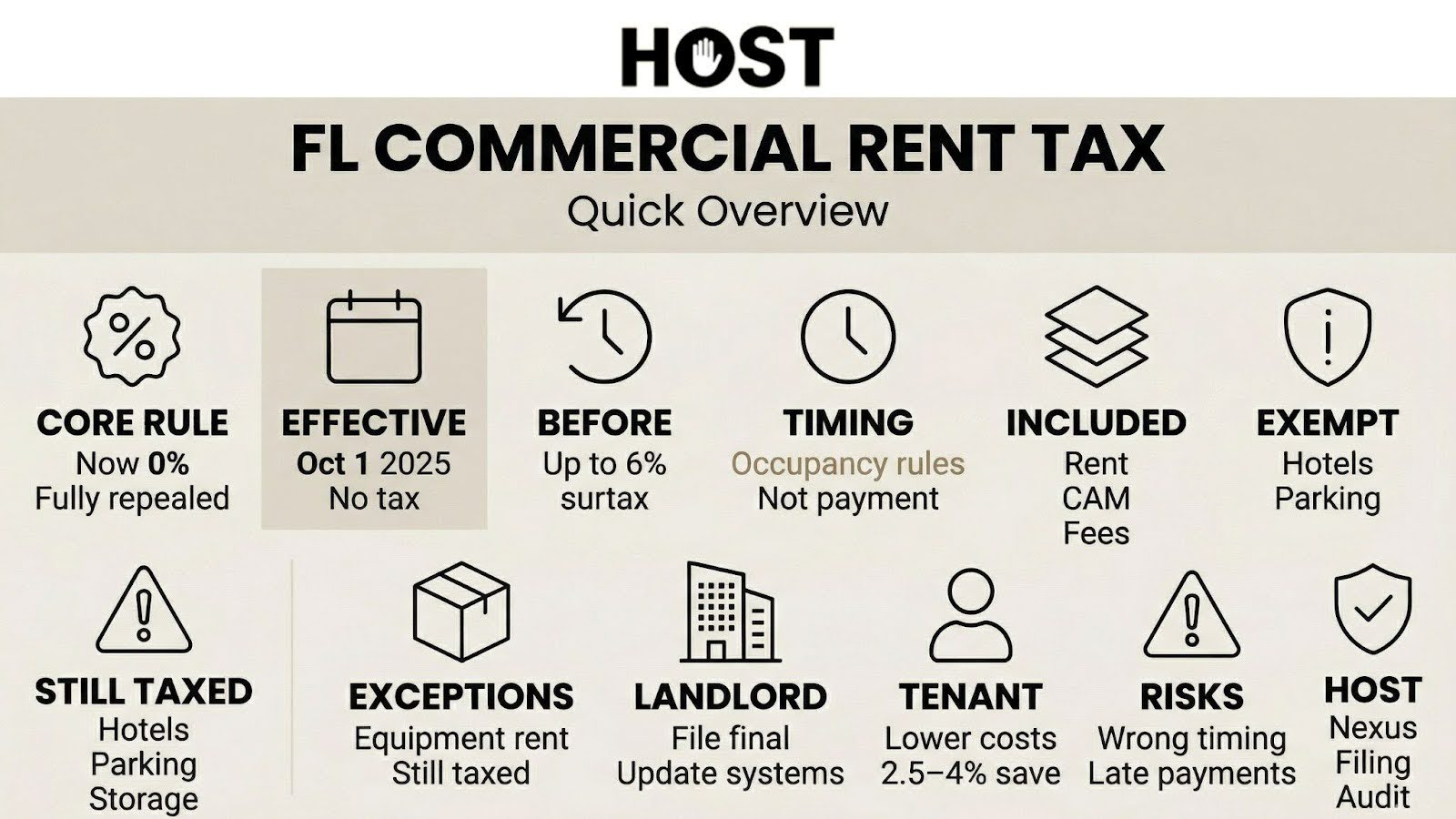 For decades, Florida stood alone as the only state taxing commercial rent. That changed October 1, 2025, when Florida eliminated both state and local sales taxes on commercial lease payments.