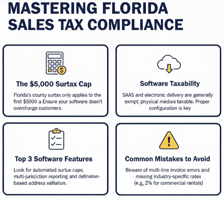 Florida-specific support: When evaluating vendors, ask specifically about their experience with Florida’s surtax complexity and software taxability rules. Generic support teams may not understand these nuances.