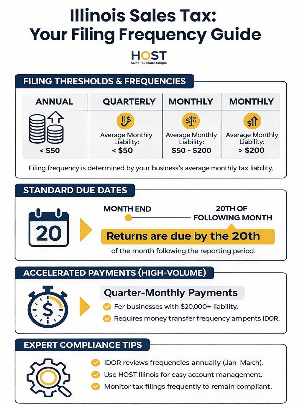 The Illinois Department of Revenue (IDOR) assigns your filing frequency based on your initial registration and annual tax liability. If there’s a change in your average monthly liability, IDOR adjusts your filing frequency and notifies you accordingly.