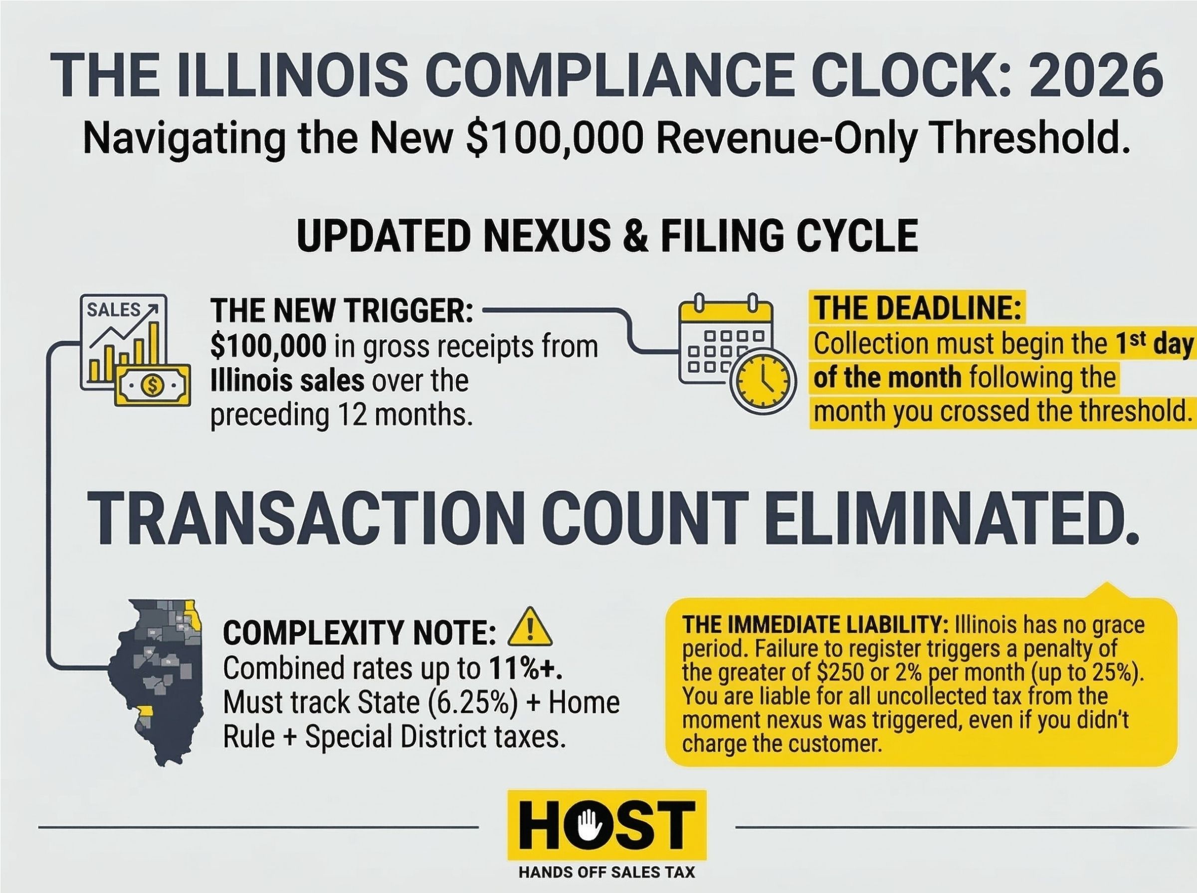 Economic nexus now triggers on one metric: $100,000 in gross receipts from Illinois sales over the preceding 12 months.