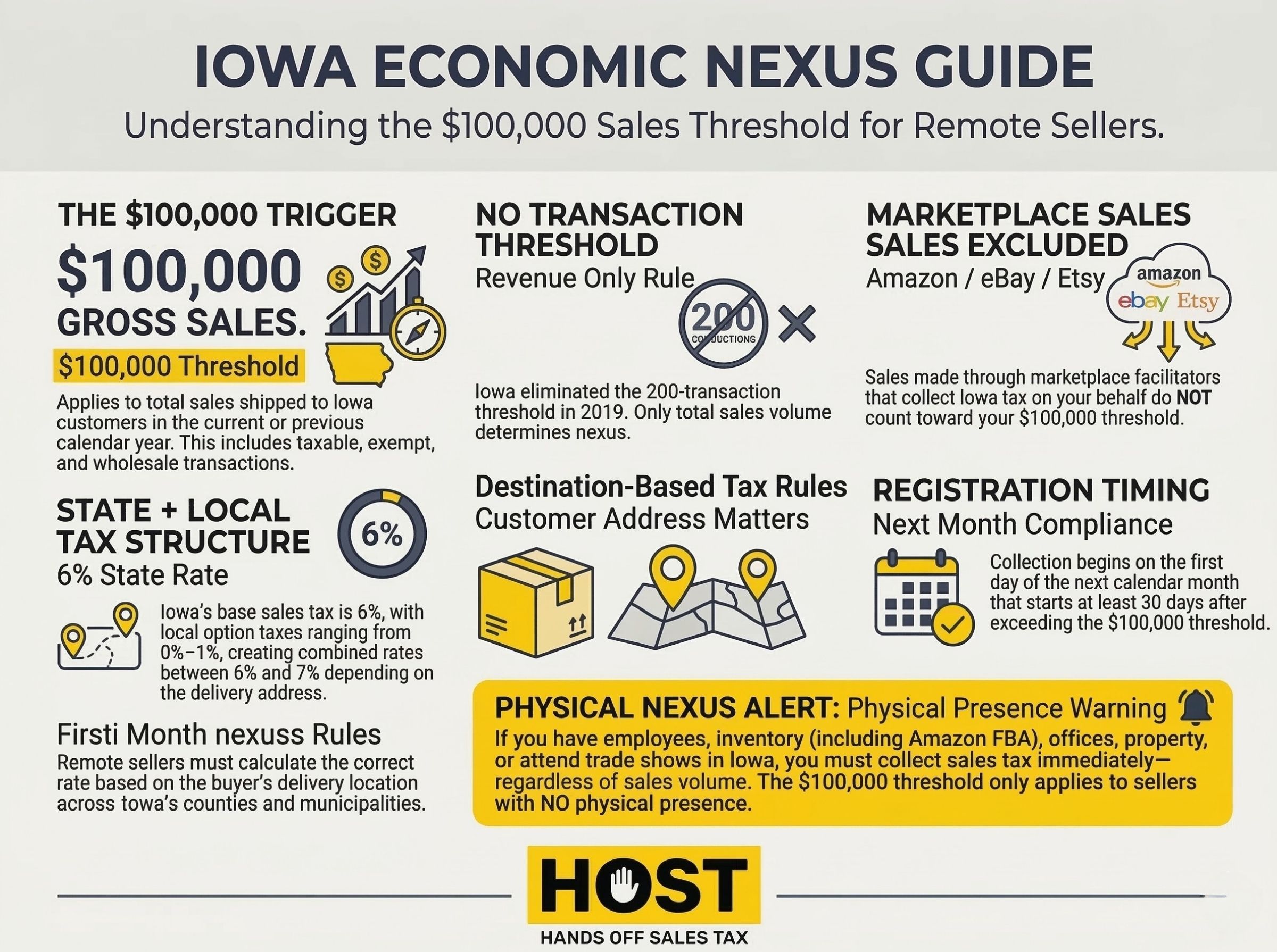 Physical vs. Economic Nexus: Physical nexus still applies if you have Iowa offices, warehouses, inventory (including FBA), employees, or attend trade shows in Iowa. Physical presence triggers collection obligations regardless of sales volume. Economic nexus applies only to remote sellers without physical presence.