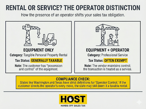 The operator distinction creates a critical tax divide. States like Indiana, Michigan, Washington, and Idaho treat equipment rented with an operator as a service rather than a rental. Services often escape sales tax that rentals face. Rent a crane alone? Taxable. Rent the same crane with an operator? Often exempt. The line between taxable rental and non-taxable service can save (or cost) substantial money.