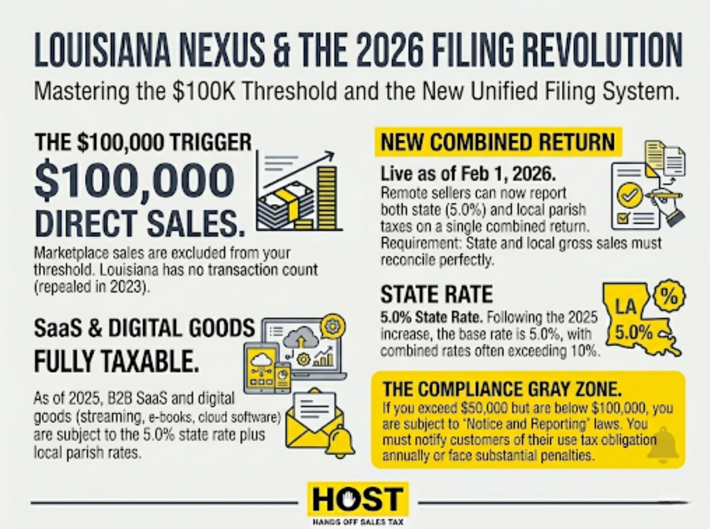 This is precisely why HOST exists. We’ve focused exclusively on sales tax for over 25 years. Our team monitors your nexus across all states, handles registrations wherever you’ve triggered obligations, and files returns everywhere on time.