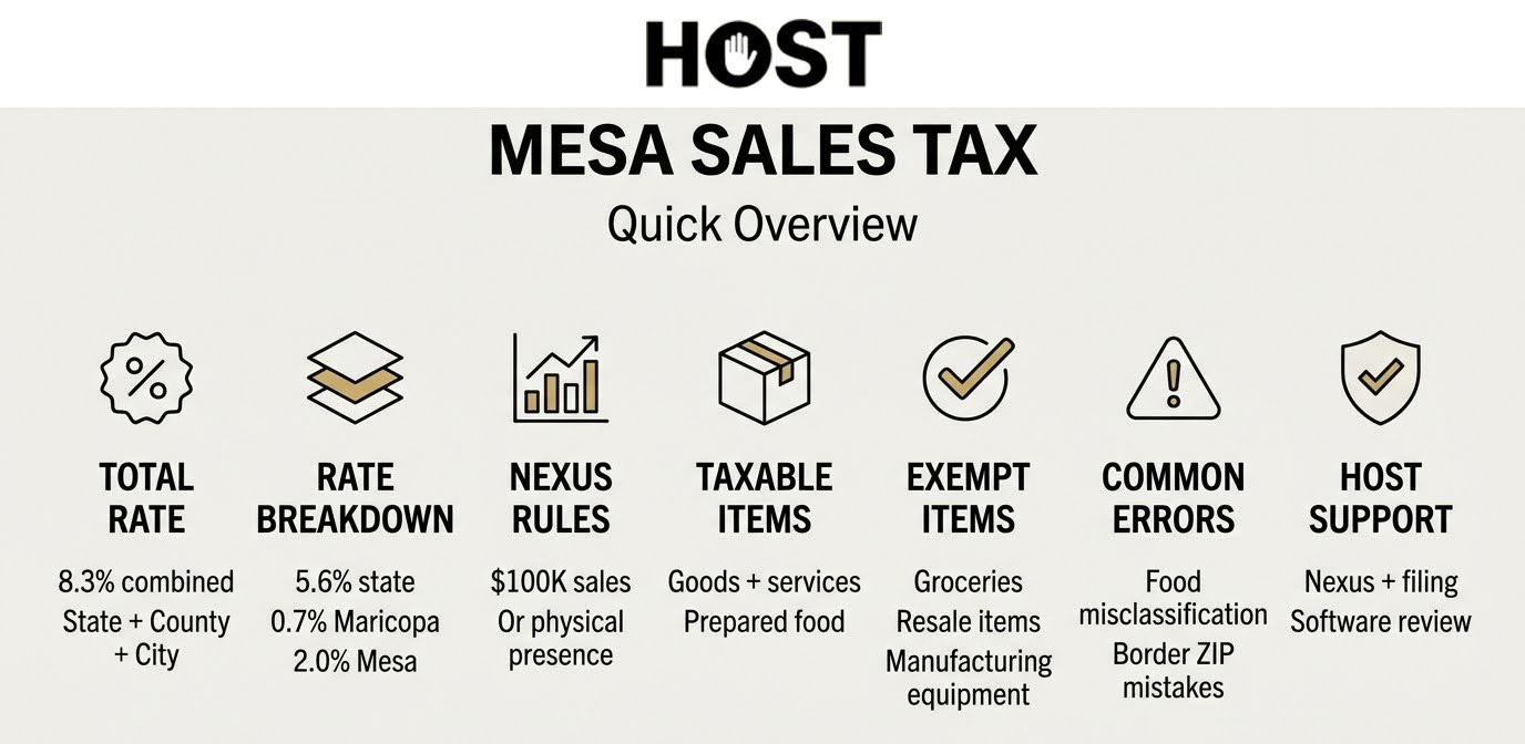 The combined rate in Mesa is 8.3%: 5.6% Arizona state TPT, 0.7% Maricopa County, and 2.0% Mesa city tax. Border ZIP codes may vary slightly.
