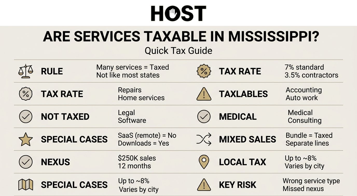 Ready to ensure your service business collects Mississippi sales tax correctly? Contact HOST today to discuss your specific situation.