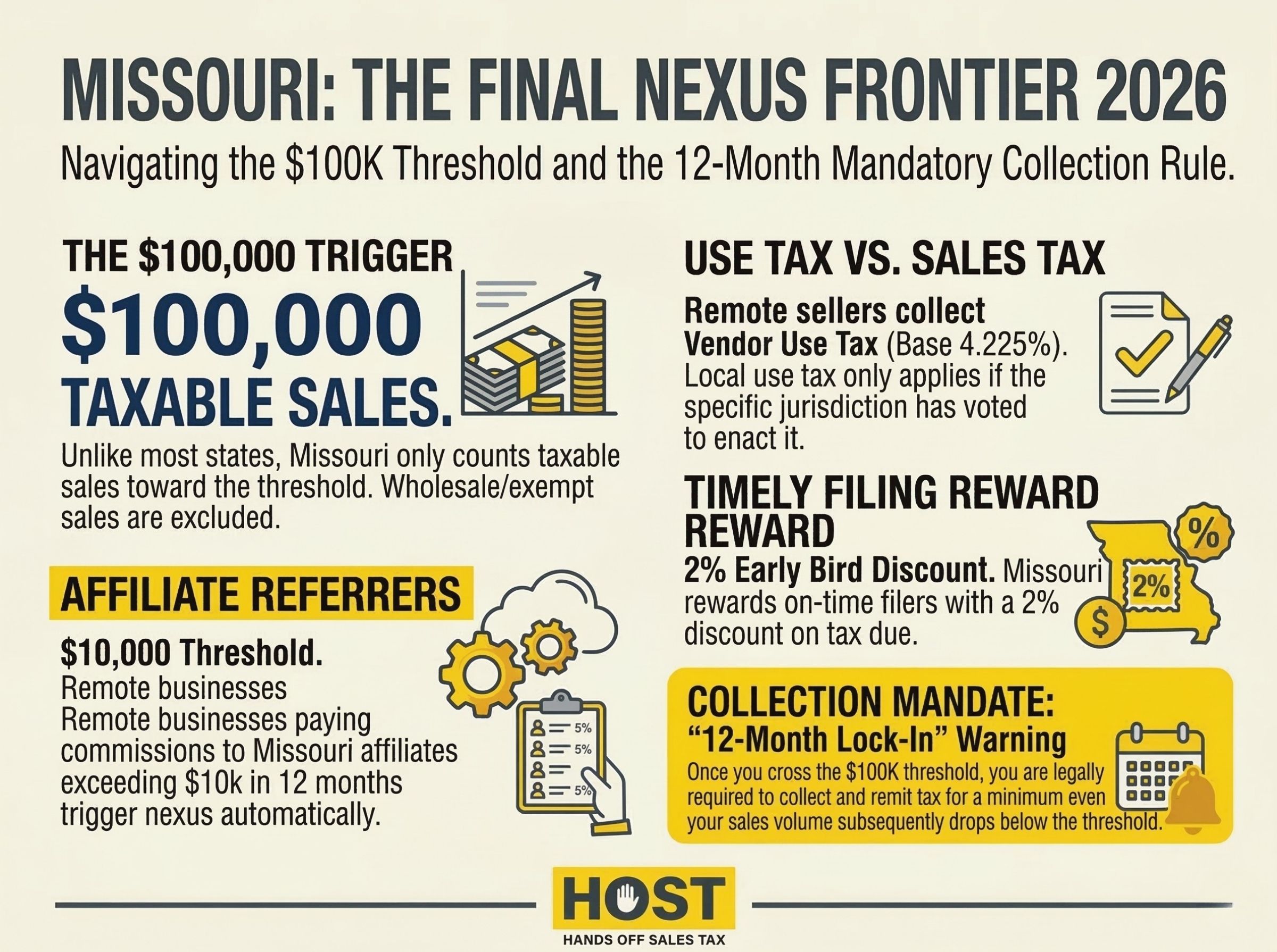 Cross $100,000 in Missouri sales, and economic nexus triggers. No warehouse, no office, no physical presence required. For e-commerce sellers shipping into the Show-Me State, this single threshold determines whether you’re collecting and remitting sales tax or risking penalties.
