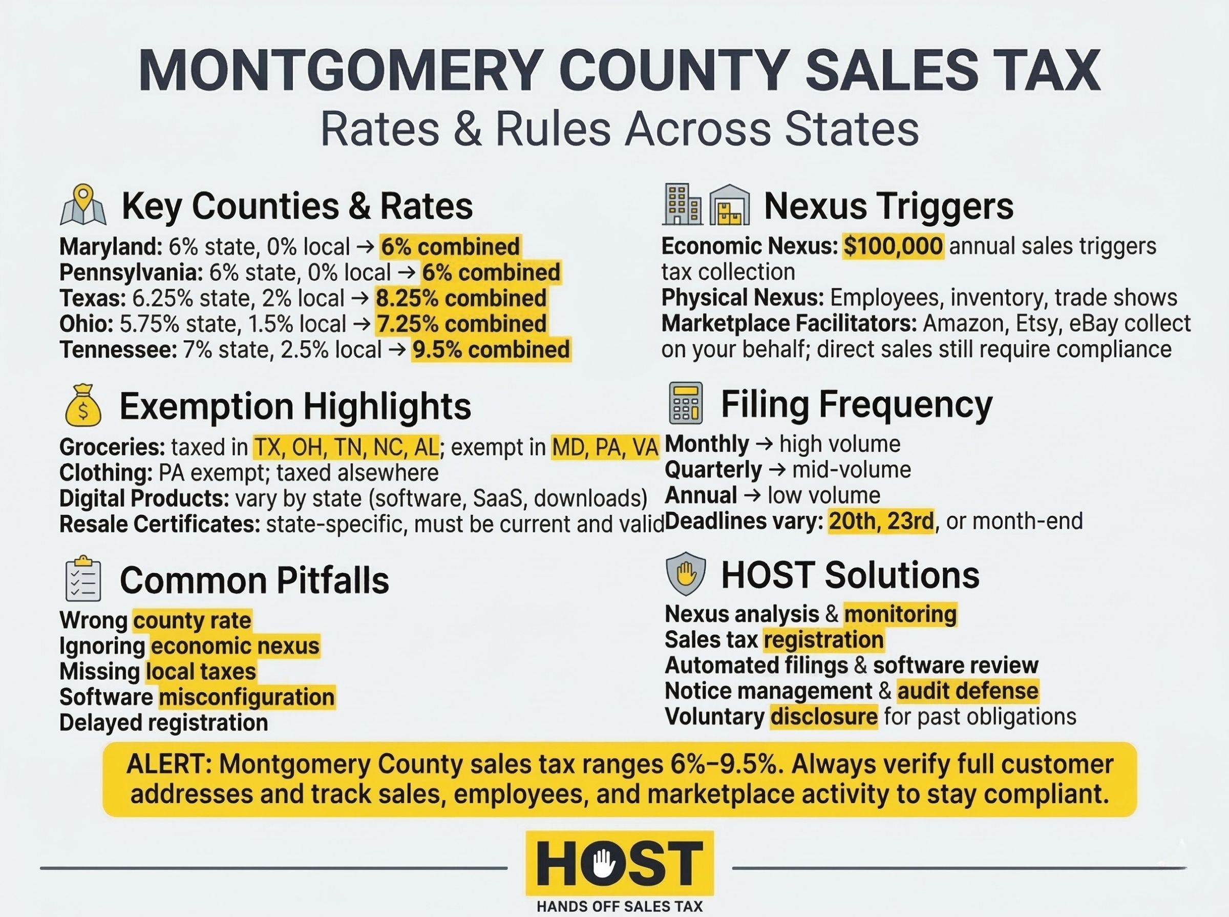 Yes. HOST manages compliance across all states and jurisdictions where you have nexus, including all Montgomery Counties. We determine obligations, register correctly, calculate proper rates, and file returns so you stay compliant without the complexity.