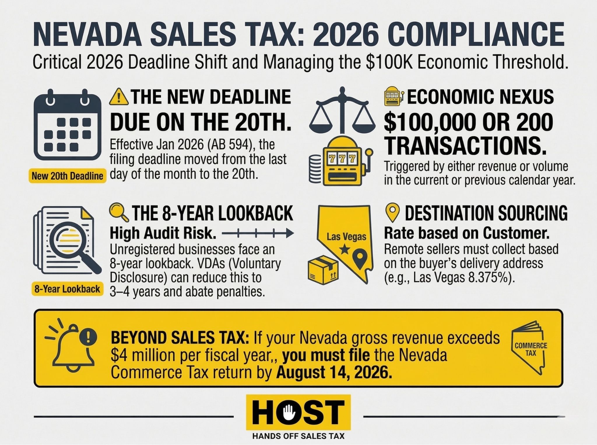 At Hands Off Sales Tax (HOST), we’ve guided businesses through Nevada nexus analysis, registration, and ongoing compliance for over 25 years. Whether you’ve just crossed the threshold or discovered past obligations, understanding Nevada’s specific rules prevents costly mistakes.