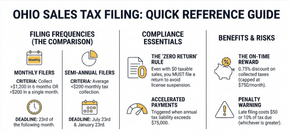 Ohio categorizes businesses into two primary filing schedules: monthly and semi-annual. Your assignment depends entirely on how much tax you collect.