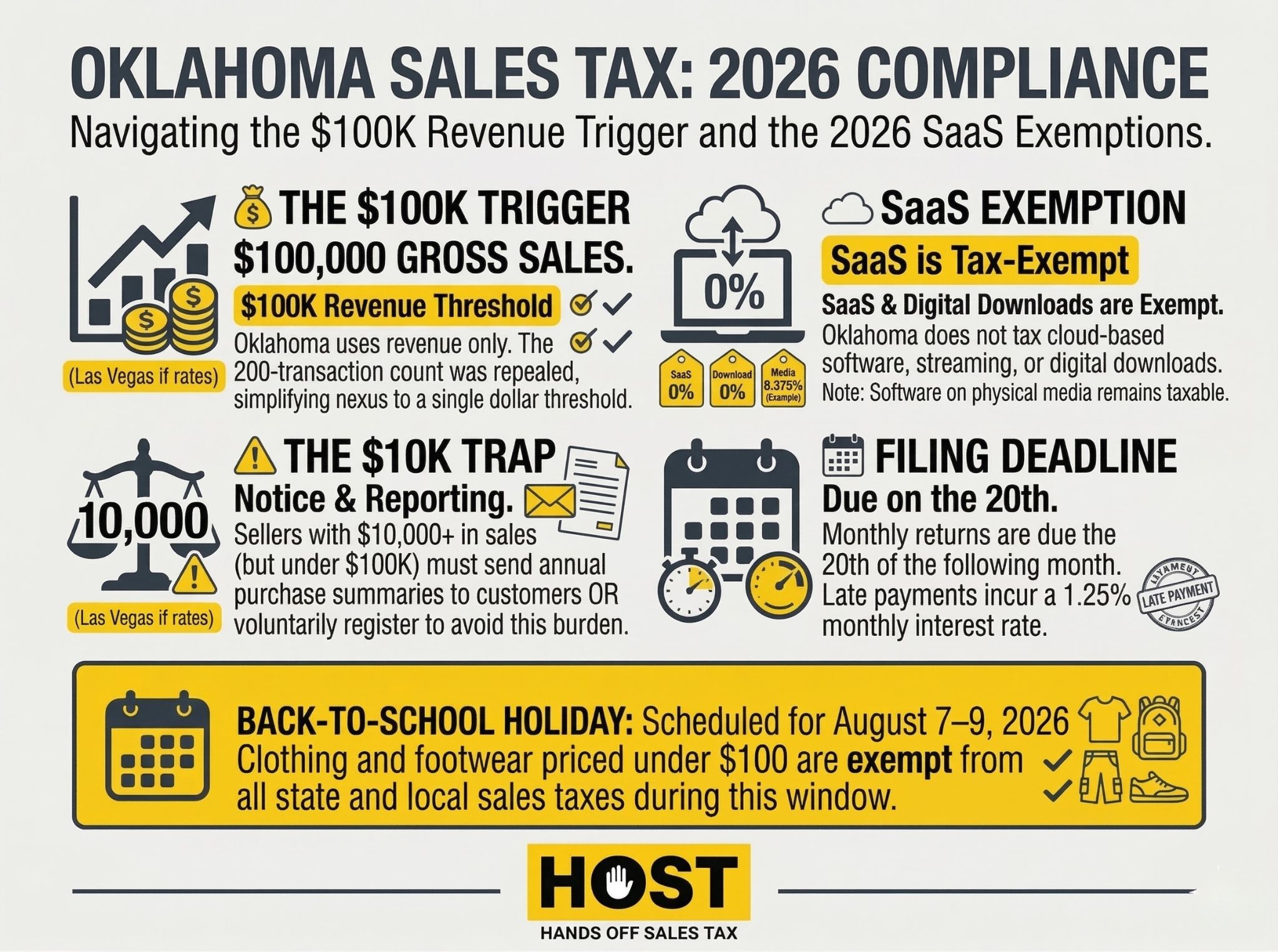 Sales Tax Holiday: Oklahoma offers an annual back-to-school sales tax holiday on the first Friday, Saturday, and Sunday in August. Clothing and footwear priced under $100 are exempt during this period, which is important for retail businesses planning seasonal promotions.