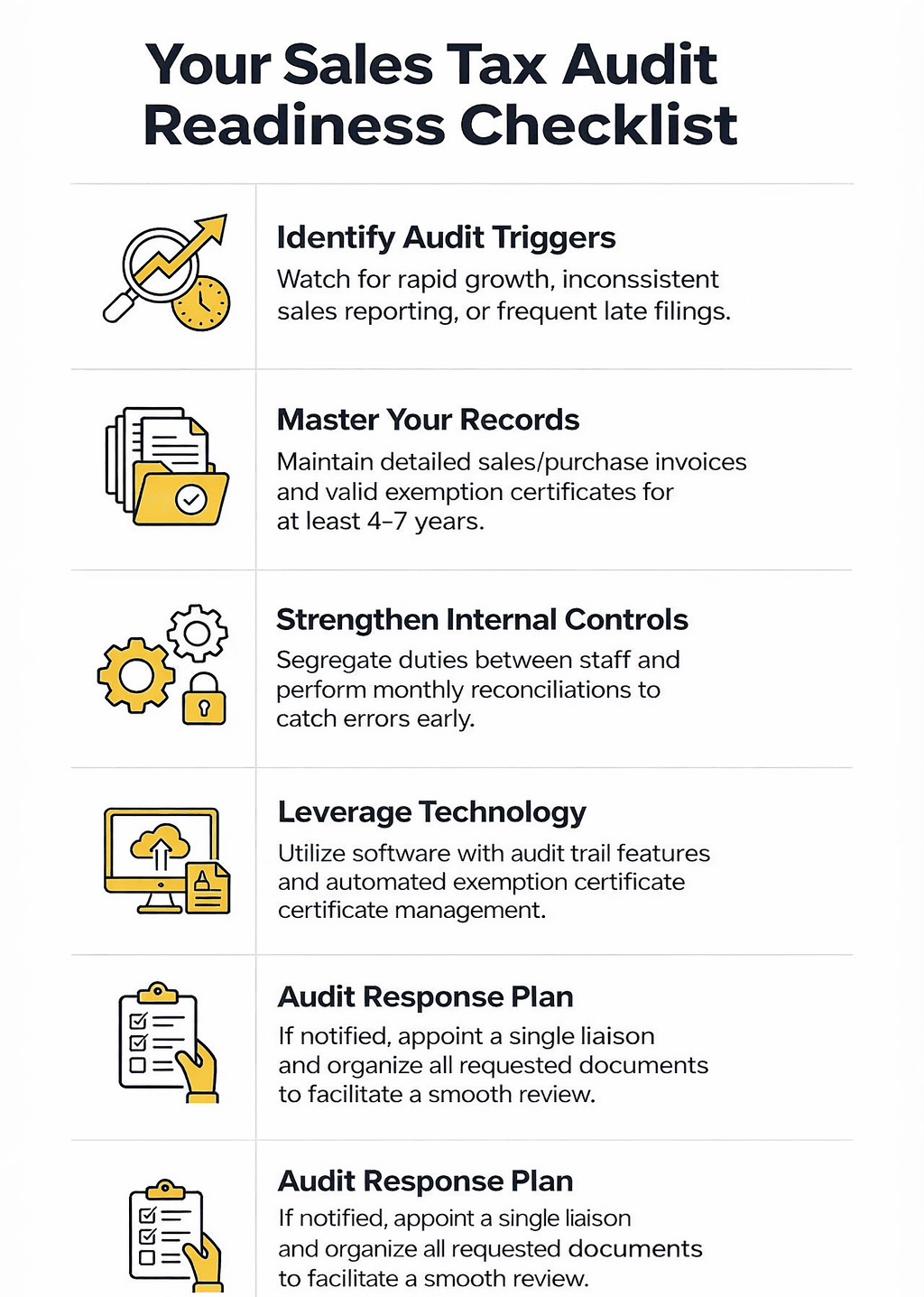 Sales tax compliance is a critical responsibility, and failing to prepare for an audit can lead to costly penalties. By maintaining accurate records, implementing internal controls, staying informed on tax laws, and leveraging automation, businesses can significantly reduce audit risks. A structured sales tax audit checklist ensures readiness and peace of mind.