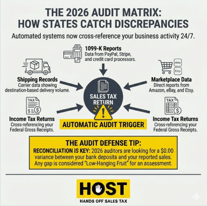 States now cross-reference multiple data sources automatically. Your sales tax returns get compared against marketplace facilitator reports (Amazon, eBay, Shopify), credit card processor data, and shipping records.