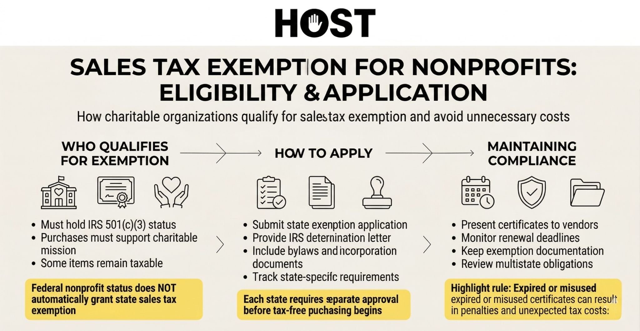 If your nonprofit operates across multiple states and needs clarity on exemption eligibility and application procedures, HOST provides comprehensive guidance tailored to charitable organizations navigating multi-state compliance.