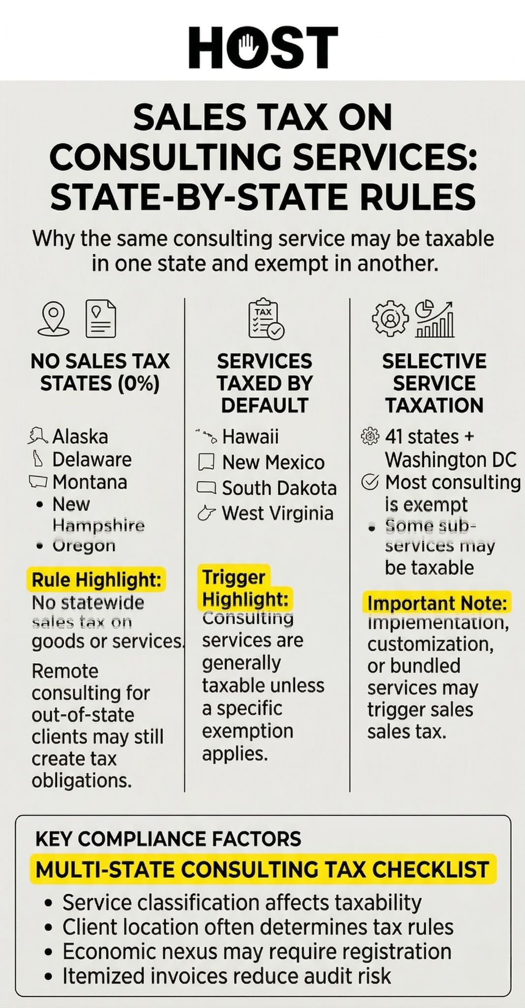 If you’re navigating multi-state consulting obligations and need clarity on where you owe tax, HOST offers comprehensive nexus analysis and compliance support tailored to service-based businesses.