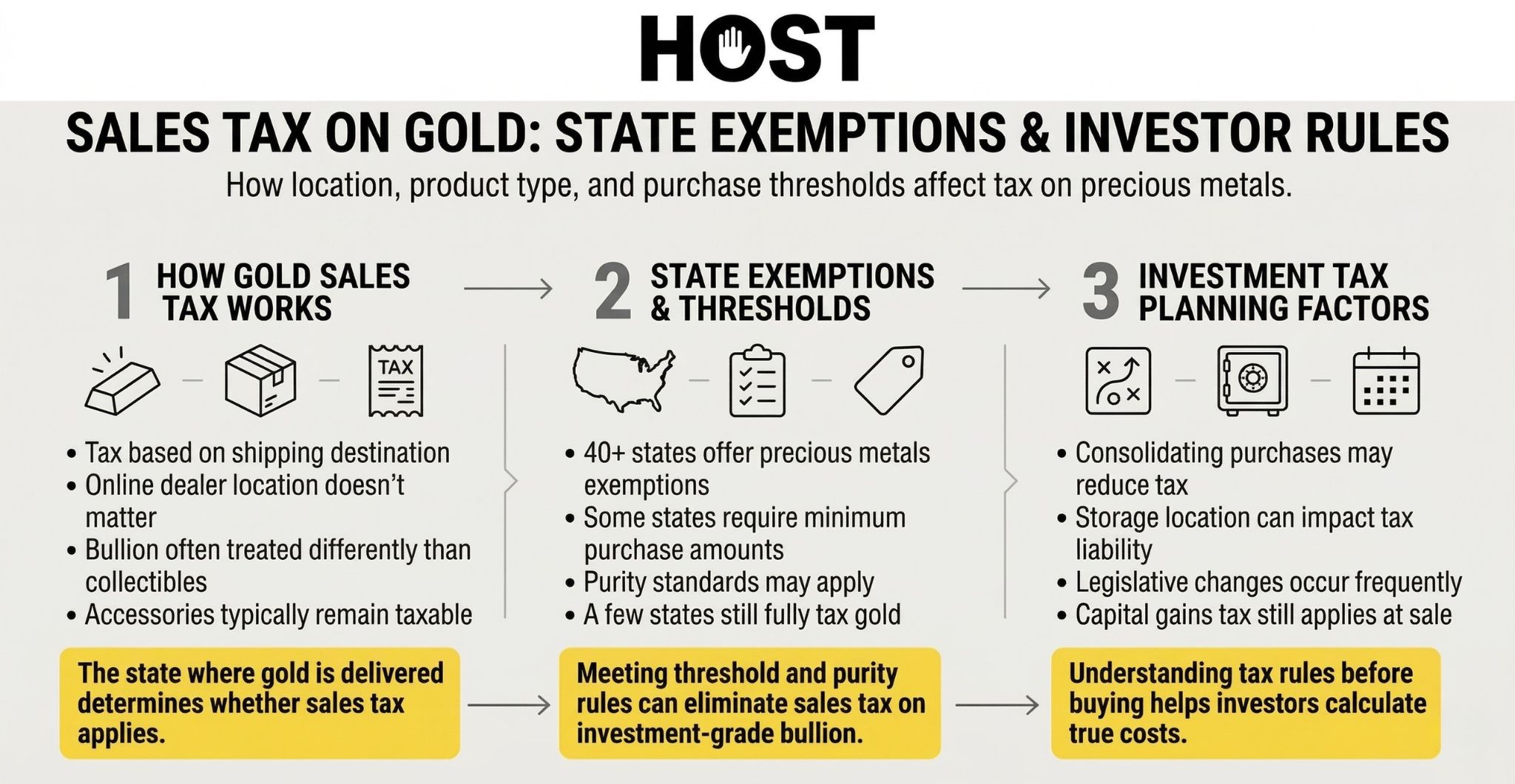 Consulting with a tax professional familiar with precious metals investments ensures you understand the complete tax picture and structure holdings optimally. Schedule a consultation with HOST to discuss sales tax compliance strategies for your precious metals business.