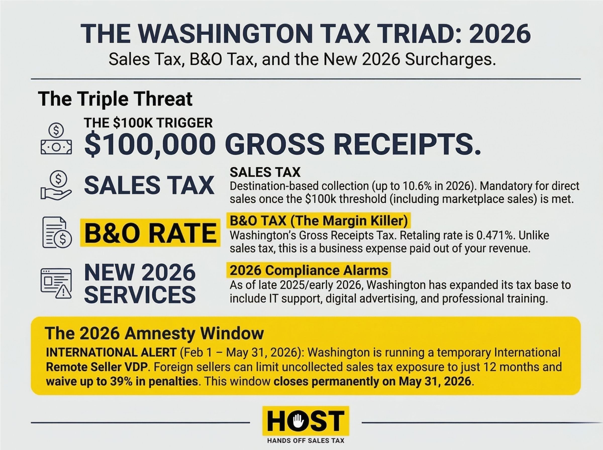 Here’s what catches e-commerce sellers off-guard: crossing Washington’s $100,000 threshold creates Business & Occupation (B&O) tax liability.