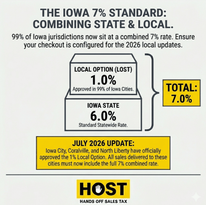 The state rate sits at 6%. Most localities tack on a 1% local option sales tax, bringing the combined rate to 7% in virtually every Iowa city. This makes Iowa one of the more predictable states for rate calculations, which means you’re almost always collecting 7%.