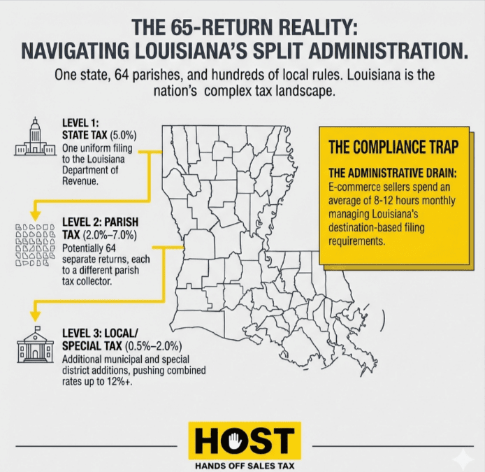 Split Administration: Louisiana splits administration between the state Department of Revenue and 64 parish tax collectors. Each parish has its own filing system and deadlines. A statewide business might file 65 separate returns.