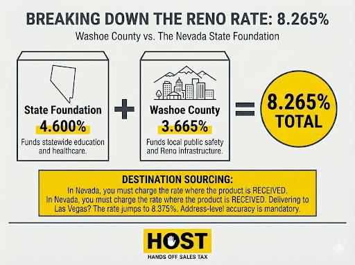 Destination-based sourcing means precision: Reno deliveries require 8.265%, Carson City needs 7.6%, Las Vegas demands 8.375%.